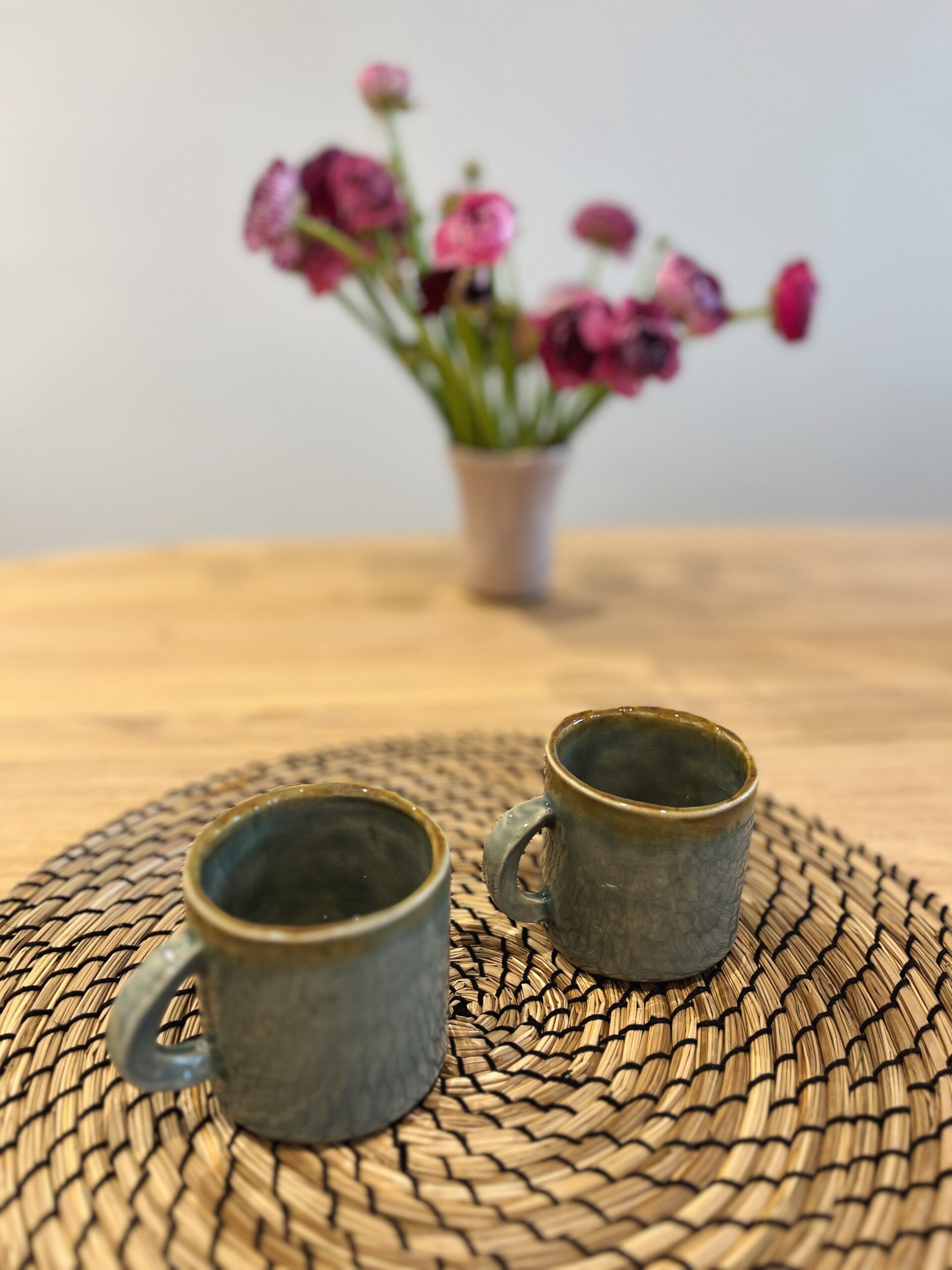 Deze koffiekoppen zijn met de hand gemaakt (opbouw), geglazuurd in kleur mist en afgewerkt met een licht bruin randje. Ze werden gebakken op voldoende hoge temperatuur waardoor ze volledig waterdicht zijn. Deze koppen kunnen in de microgolfoven en in de vaatwasser. Afwassen met de hand wordt echter aangeraden om de diepe kleuren en glans beter te bewaren.